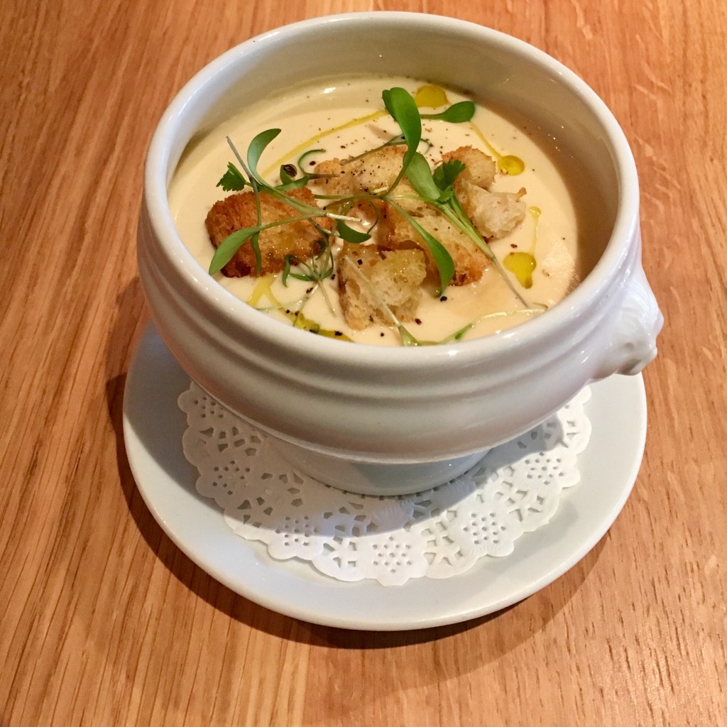 Not long after I placed my order, my water was brought to the table. I really appreciated that they left me the jug on the table: it’s not as much of a regular occurrence as it should be. Shortly after my soup spoon was brought to be on a dish, on top of a cloth napkin, with all the formality of a fine dining experience. These details are not lost on me.