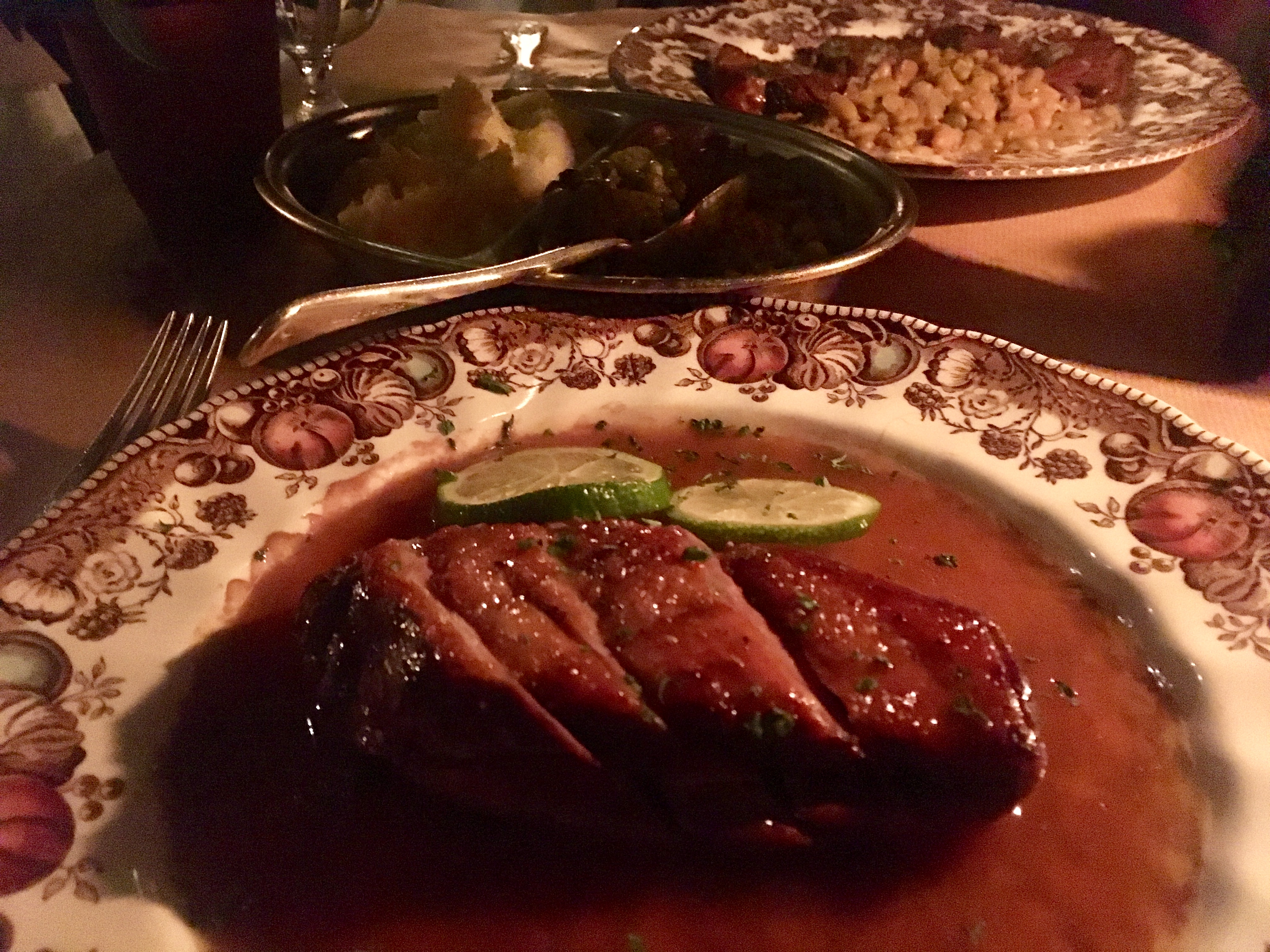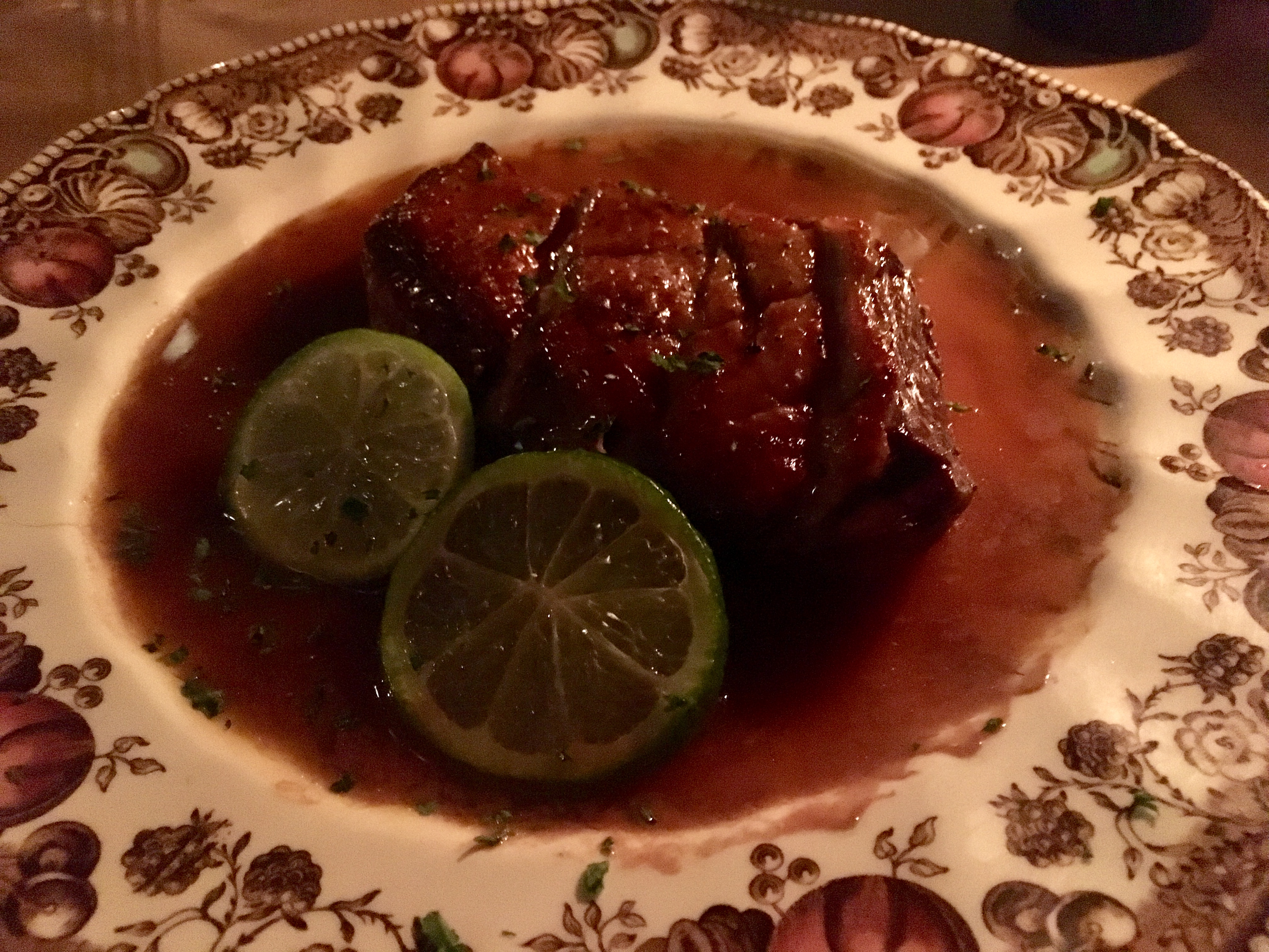I ordered a main dish that was intriguing to me: duck breast in lime sauce. I’ve seen duck prepared with berries, apple and even orange, but I’ve never seen lime as the predominant flavour accompanying the duck. I was fascinated; I had to order it. Upon its arrival, the aroma was as heavenly as the taste. I was absolutely delighted to experience the delicate flavour this sauce (thick in consistency as a sauce, not a jus). Both the sweetness and the tanginess of the lime come through, but in such a delicate, refined manner that is in no way overpowering as I had feared. The duck itself was cooked to absolute perfection, and was served in a homestyle dish of mashed potatoes and vegetables for the table.