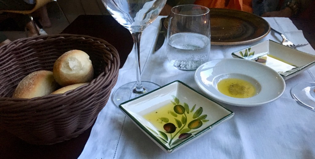 We arrived at the welcoming restaurant, which very cleverly is designed to feel like part of it is outdoors: part restaurant, part outdoor terrace complete with greenery hanging from above in a refined, elegant way. This feeling is carried on once you are seated, as it is clear that much thought has been put in the design and selection of flatware, glassware and general table setting. Not long after, a selection of delicious, soft bread rolls arrive and are served with olive oil – but this is not just any olive oil! Three of them are served and the photo above, you see olive oils infused with rosemary, lemon and basil. I can assure you, they were all absolutely delicious! The flavours of the infusions were clearly evident without being too overpowering, and you can see from the colour alone before you even taste that this olive oil is of a superior quality. What a great start to the meal…