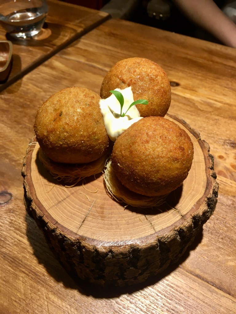However, just after we had devoured our bread, the most tempting site on a plate that I had seen for some time whizzed past me to another table, and I knew I just had to try the croquettes. They seemed irresistible on their wood/tree inspired plate (like the rest of the restaurant decor), those perfectly shaped golden balls. I will not deny that there was something rather, ahem, sensual about their appearance, but food has had a long history of tempting all the senses from the beginning of time, and as a woman with Latin roots, I have no difficulty acknowledging that food also has a place in that sphere as well. In any case, the croquettes were perfect: the pork inside combined with the runny quail’s egg blended beautifully and felt very much like comfort food after the strenuous day we had. I was already delighted, and the main course had yet to come.