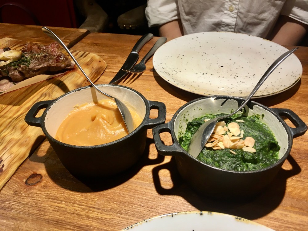 We also ordered a couple of side dishes to accompany the entrecote. The mashed sweet potatoes with lemon and orange were light and refreshing, something I didn’t think could be said of mashed potatoes. The citrus flavour comes through without being overpowering, and we didn’t leave a drop behind. We also ordered the spinach puree’ with toasted almond petals, and this might have been my favourite: any time someone makes spinach into something so creamy and tasty that it feels like comfort food, it feels like a special event.