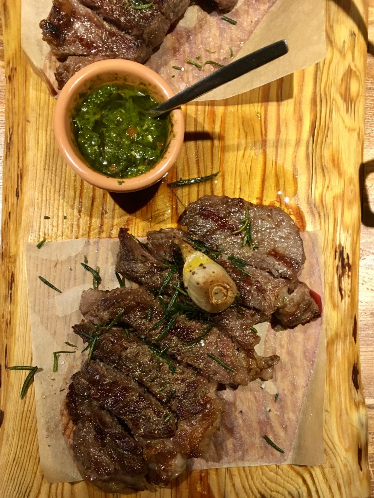 And then, it did. The dry-aged grilled entrecote, 15 days matured, pre-sliced, arrived ceremoniously to our table, topped with a garlic clove and rosemary, and served with a chimichurri sauce. It was perfectly cooked (medium rare), tender, and delicious. I am a firm believer that when steak is properly cooked, it doesn’t need a sauce to accompany it; and so, it speaks for itself that I didn’t even touch the chimichurri.