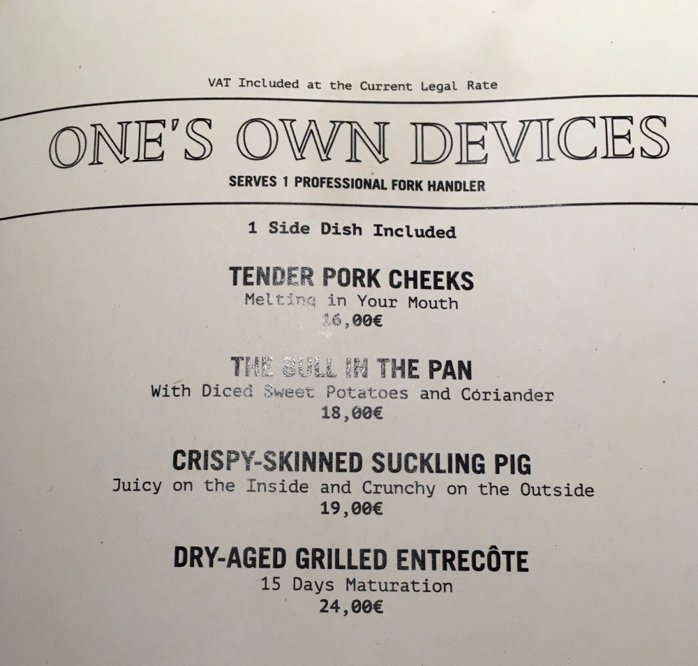 The menu presented us with several delightful options, but we wanted to stay light and order the steak, with no appetiser. That was the plan, and in fact, and we stuck to it when we ordered. Which we thought would be fine when the bread basket came, with selections of delicious bread (soft, thick white and soft, thin rye), as well as two variations of mousses (one of chicken liver pate’, and the other was chorizo flavoured – the latter being my favourite), and the most intense flavoured olive oil with a full garlic immersed for flavour. It was all fantastic, and I wish I had taken a photo but we had walked 27,000 steps that day and I was too famished to remember! You’ll have to take my word on it…
