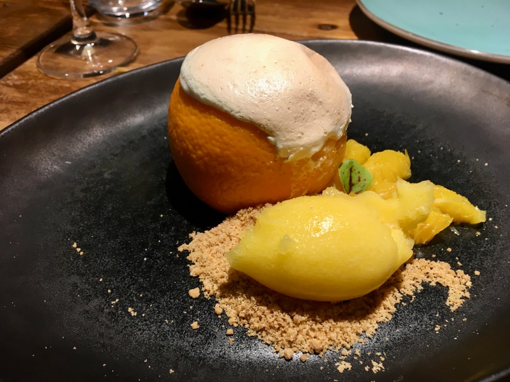 Having had such a spectacular dinner, I couldn’t possibly skip dessert. I ordered the orange souffle’ with tangerine and rosemary ice cream. And when it arrived, it was a picture to look at: very vibrant and inviting. I very much enjoyed the different textures, with the tangerine slices, the sweet crumble, the ice cream… the only issue I had is that it was not, by definition, a souffle’. The slightly firmer lid on the orange with the creamy, runny center mixed with diced tangerine underneath was very good and I enjoyed it – but it wasn’t a souffle’, and I am fairly certain this dish didn’t go anywhere near an oven. Had it been called something else I would have been entirely satisfied; having it called a souffle’ and getting something else left a little twinge of disappointment.